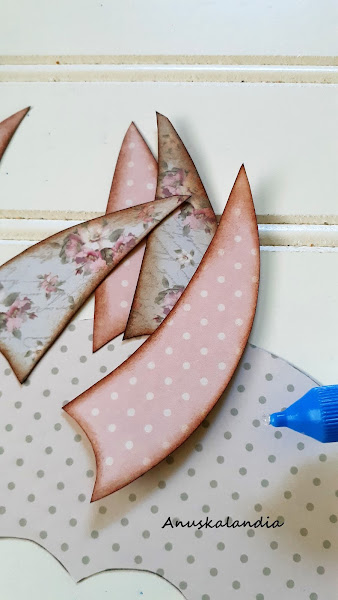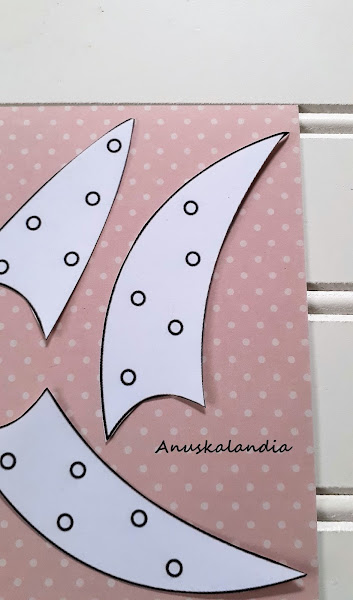 6.- El molde de las partes separadas del paraguas, lo marcamos en papeles de scrap. Recomiendo hacerlo en dos papeles diferentes al menos, para que contrasten. Recortamos.
