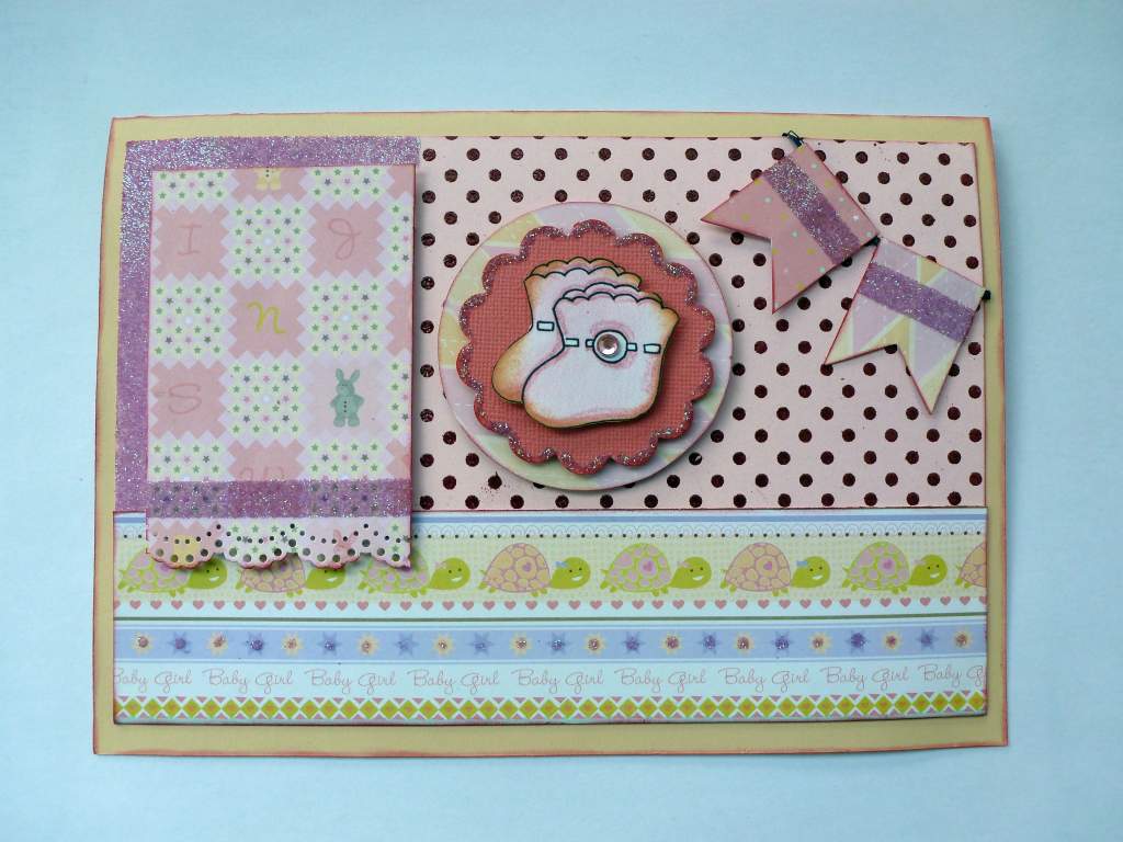 Y me puse a ello: Hice una tarjeta con recortes de una colección infantil que utilicé para un álbum de niña muy rosas, como podéis ver. Coloqué dos banderines en la parte superior derecha, y los brillos los hice colocando cinta de doble cara, y poniendo purpurina para que se quede pegada.