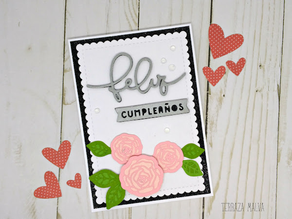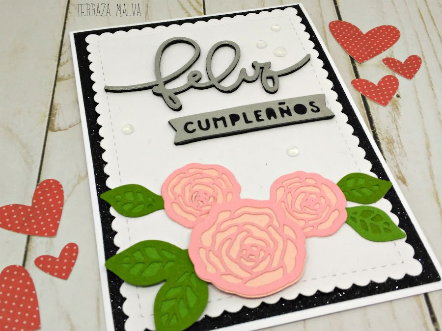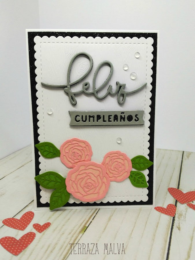 Esta vez sólo he utilizado troquelados. Las rosas son troqueles a capas en los que he utilizado cartulinas gofradas de diferentes tonos para acentuar la profundidad.