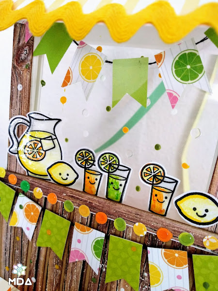 Para hacer esta tarjeta he usado restos de papeles, uno con un diseño de madera y otros en tonos ácidos (amarillo, naranja y verde) que además tienes pequeñas rodajas de limón, naranja o lima.