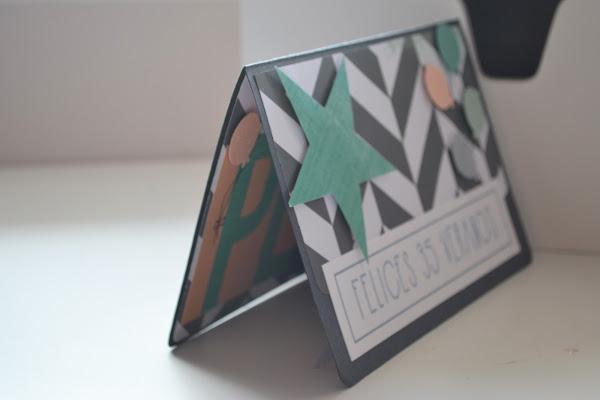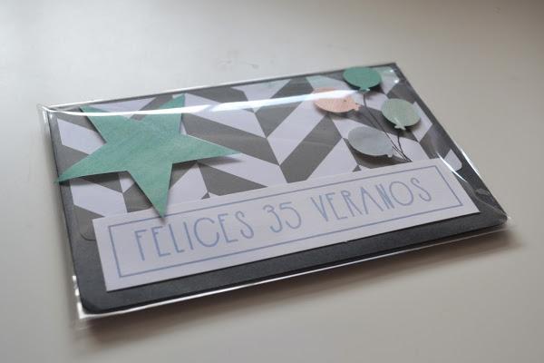 Hoy os enseño una bonita tarjeta que hice para el 35 cumpleaños de Julio. Está realizada en color negro y detalles en naranja, azul verdoso y blanco.