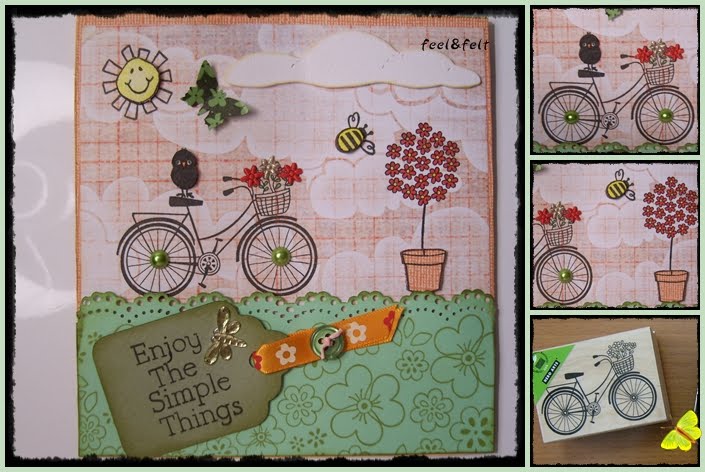 Os detallo que una vez más mi instrumento principal de trabajo son los sellos: la bici, la abeja, la maceta, el pajarillo, el sol, el estampado de flores...