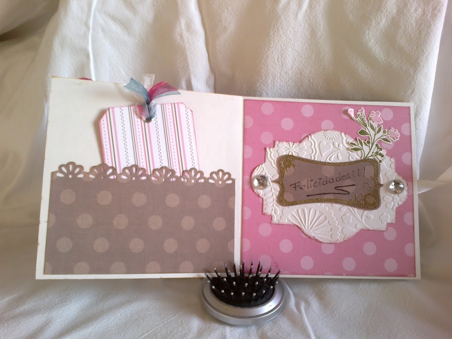 En la parte interior, un sobre troquelado con la troqueladora de Martha Stweart HALF DAYSI. Al otro lado sobre un papel de topos rosa un troquel embosado con la carpeta FLORAL FANTASY de CUTTEBLURG, rematado con un par de brillantes. El troquel de color marron y las flores son unos troqueles con sello de HERO ARTS, gentileza de mi amiga CRISTINA
