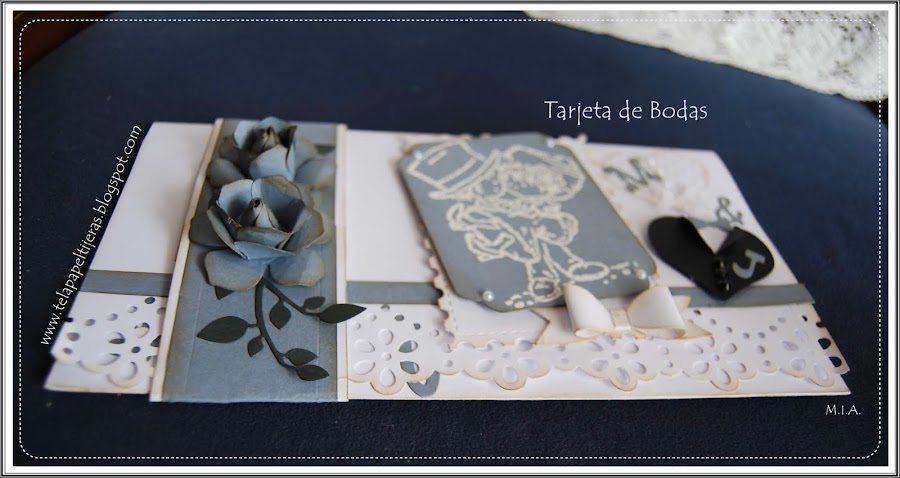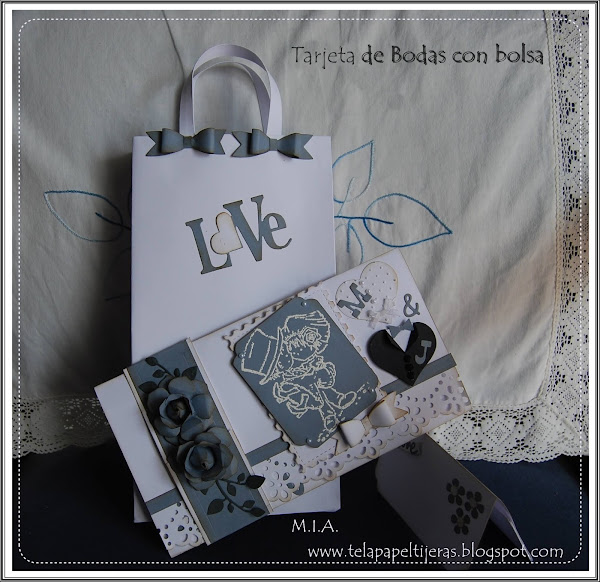 Con cartulinas blanca y gris, embosing con polvos blancos y adornos caseros hice esta tarjeta de bodas con sobre para meter regalo y tag para felicitar y para terminar hice una bolsa en la que meterla para entregar.