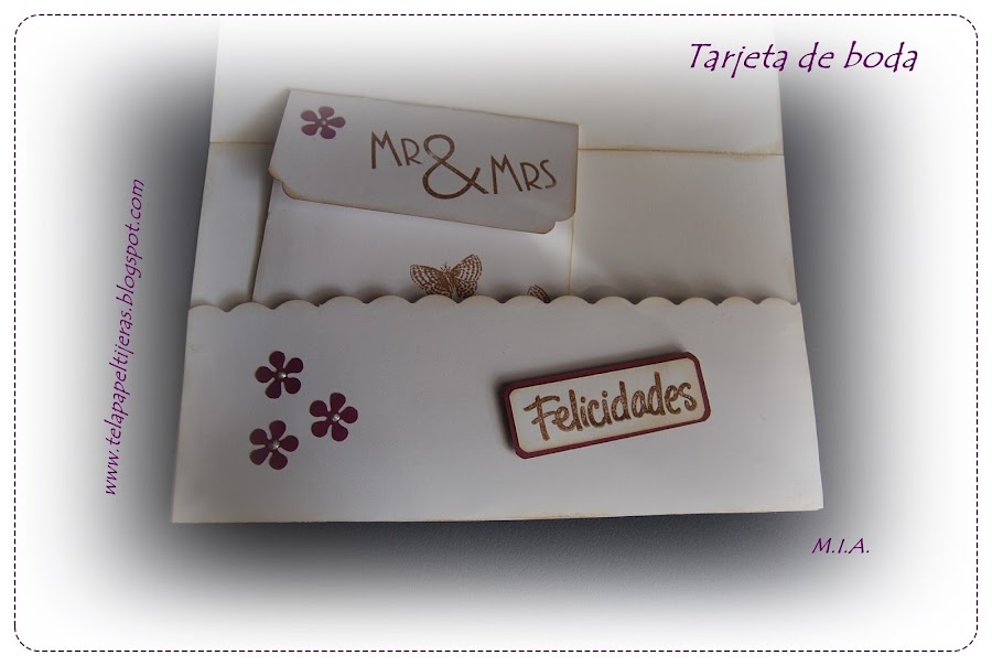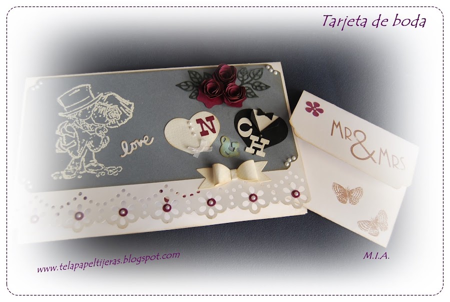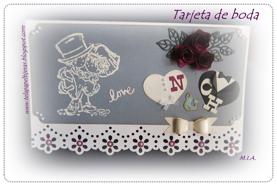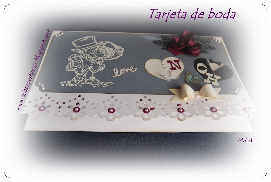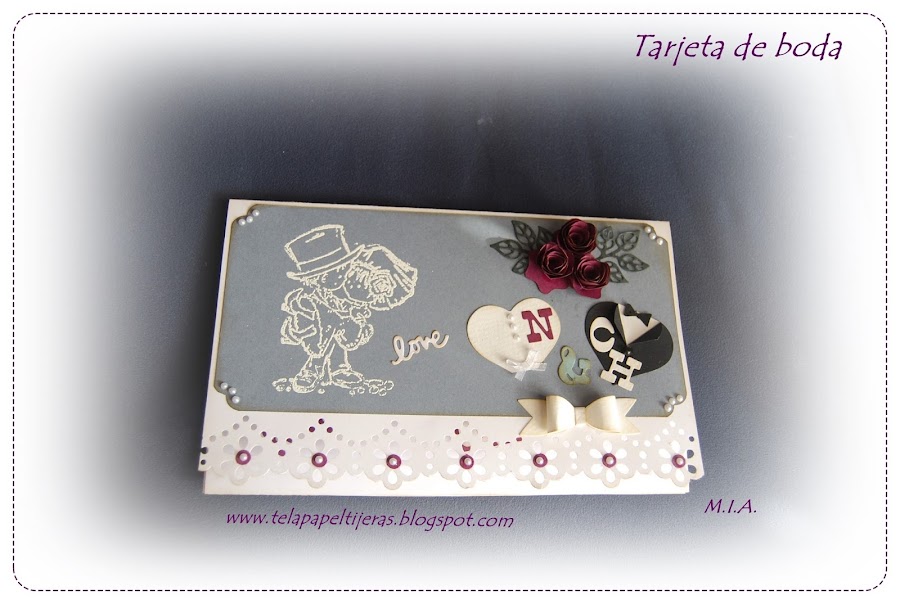 Combinación de cartulinas blanca, gris y berenjena... Embosado blanco y flores caseras.