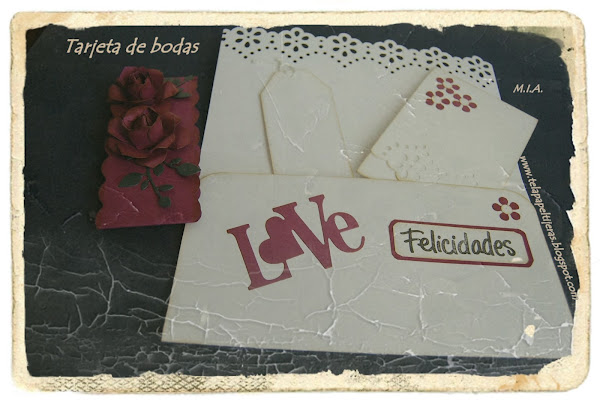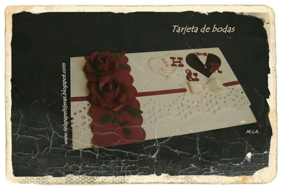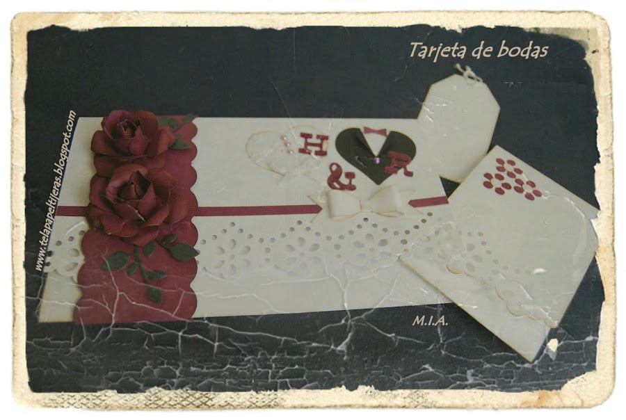 Cartulina blanca texturizada combinada con otra burdeos de alto gramaje... Flores caseras y adornos de troqueles...