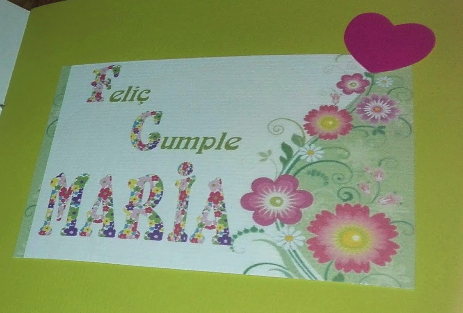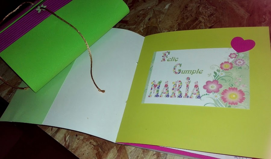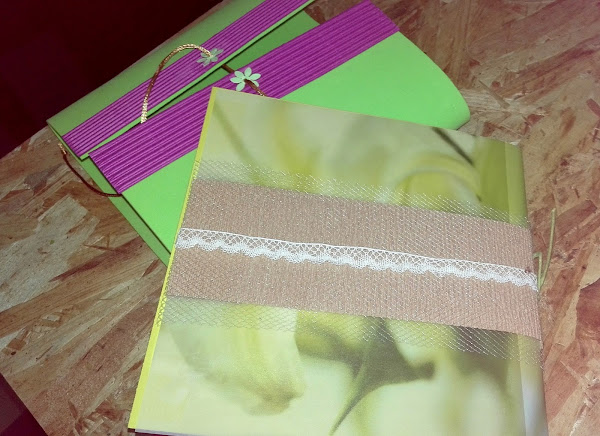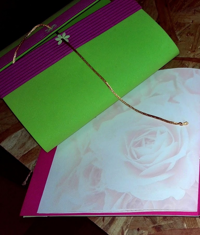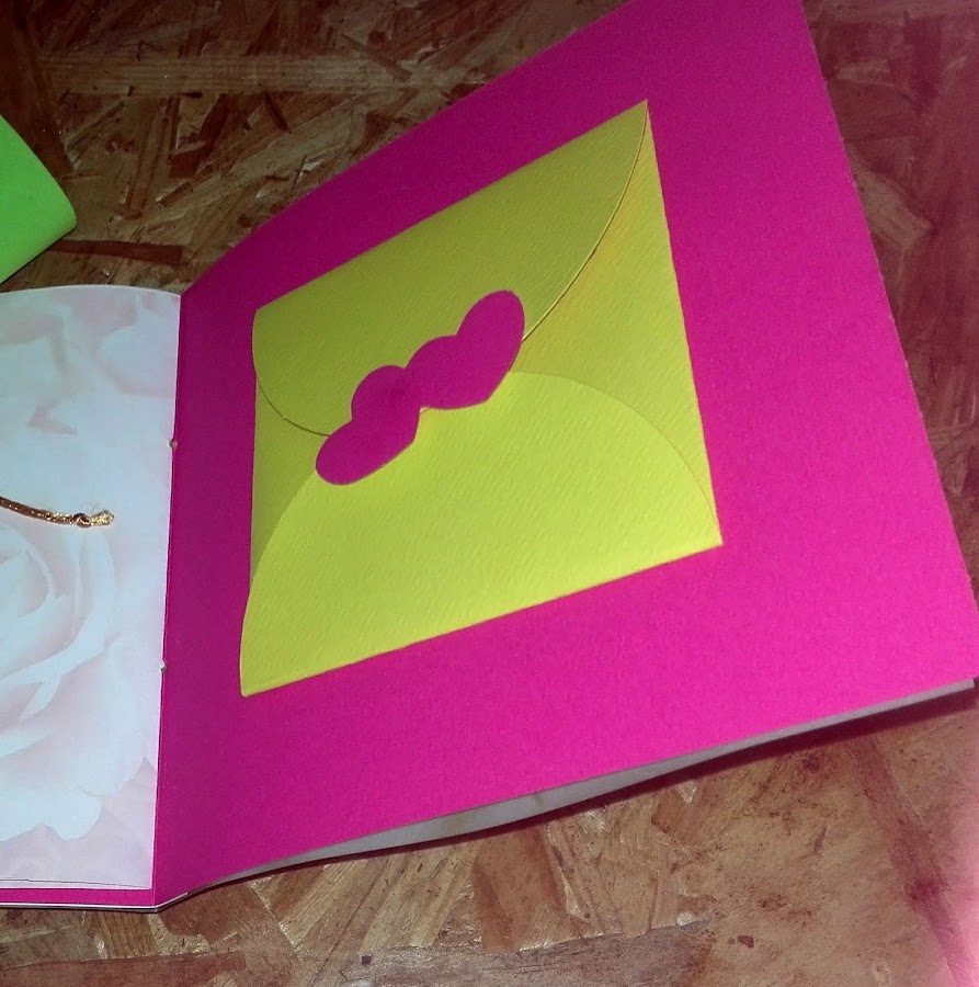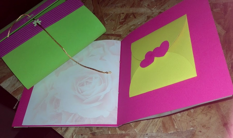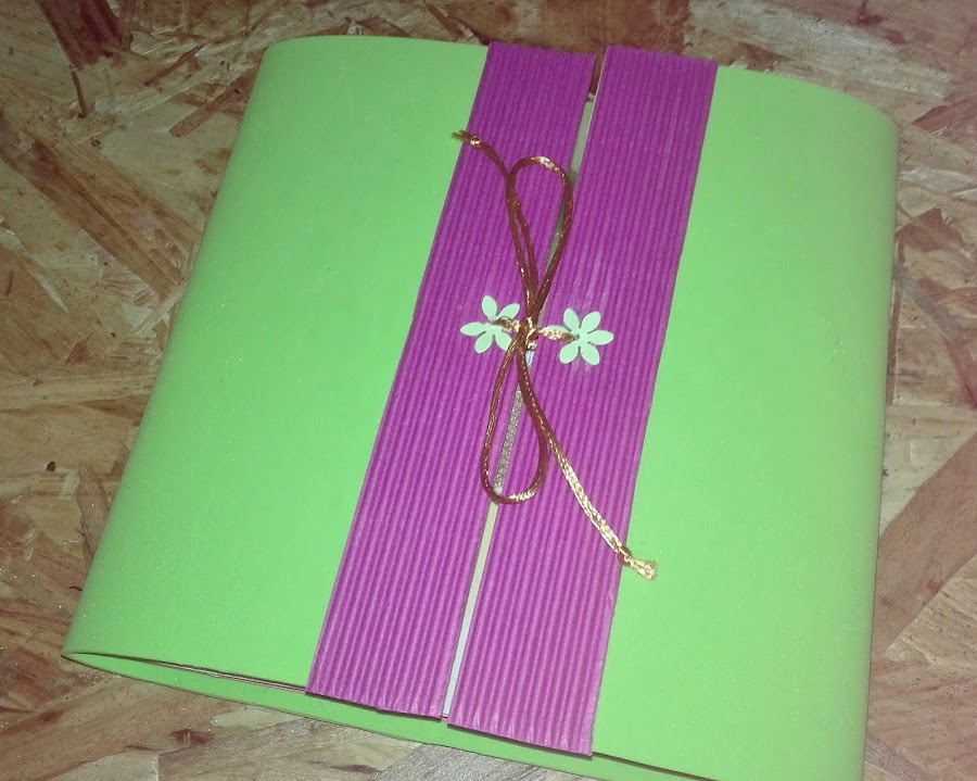 La felicitación va acompañada de una carpetita en goma-eva pistacho y unas tiras fucsia de cartón corrugado. Con unas flores troqueladas para pasar el hilo dorado que cierra el paquete.