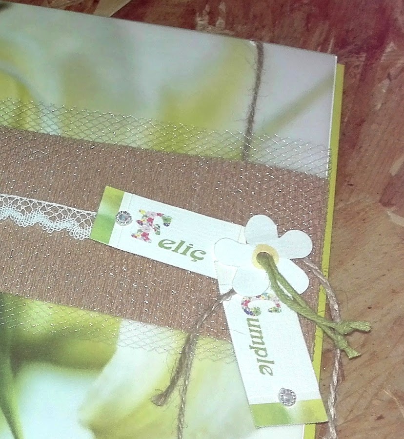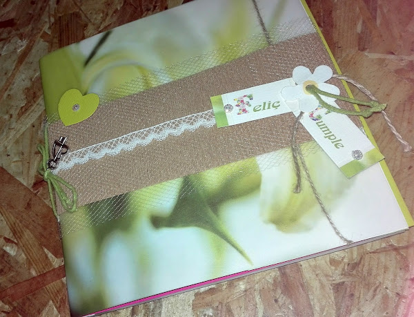 Detalle de la portada donde se aprecia que sobre la tela de saco se ha añadido un tul. Una florecita troquelada de la que sobresale una cinta de cuerda, le añade un toque rustico y combina perfectamente con el saco. Las pequeñas tarjetitas son el último detalle.
