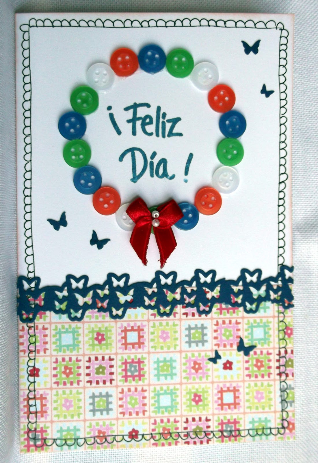 Como base de la tarjeta usé una cartulina blanca entintada con tinta Distress "Tattered rose". El papel que se ve es de la colección "Sweet Nectar" de K&Company y el borde de mariposas está hecho con la troqueladora "butterfly strips" de Tonic Studios. Recreé una corona con botones de colores y le añadí un lazo rojo. Por último, un borde hecho a mano con bolígrafo de punta fina, algunas mariposas sobrantes del borde troquelado y todo esto para desearte: ¡Feliz Día!