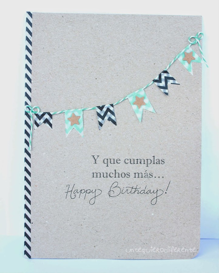 La tarjeta está hecha con papel kraft y washi tape modelo chevron para el lateral y la guirnalda donde también he añadido unas estrellitas en kraft.