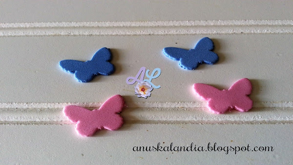 7.- Mariposas con troqueladora. He realizado 4, al final solo he utilizado 2. En los moldes hay un patrón de mariposa.
