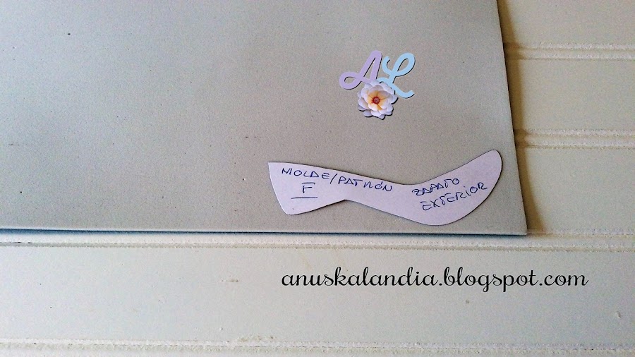 6.- El molde del zapato exterior o "F" en la goma eva lamé, por el revés y recorta.