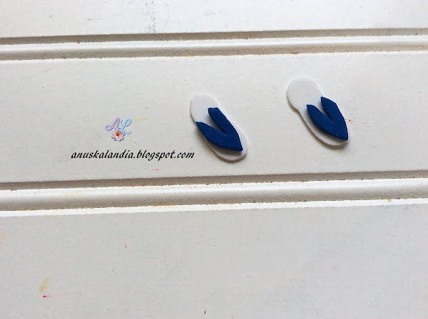 Cogemos las dos suelas blancas y las "V" del color que prefiramos. Superponemos para ver donde pegar. Gota de pegamento en la punta superior por detrás. Pegamos a la chancla. Para poner pegamento en la parte inferior, doblar la chancla como se ve en la imagen. Colocar gota y pegar.