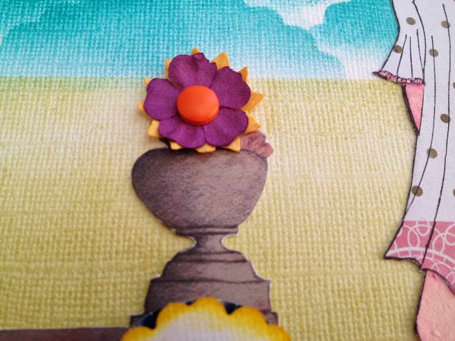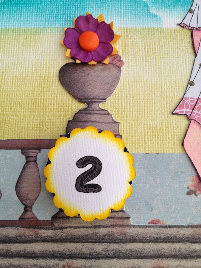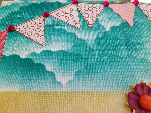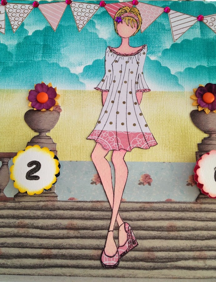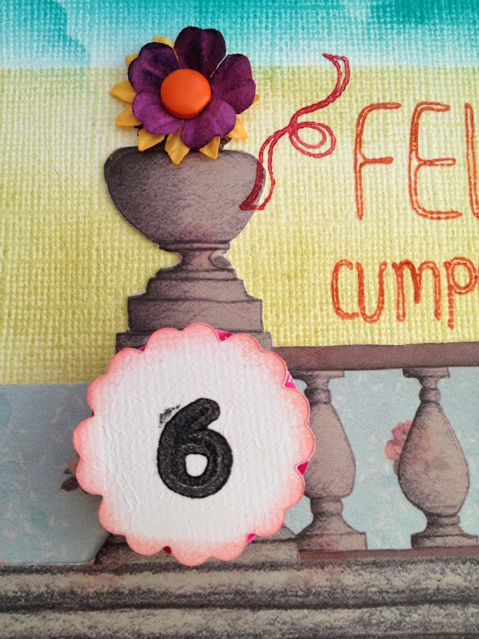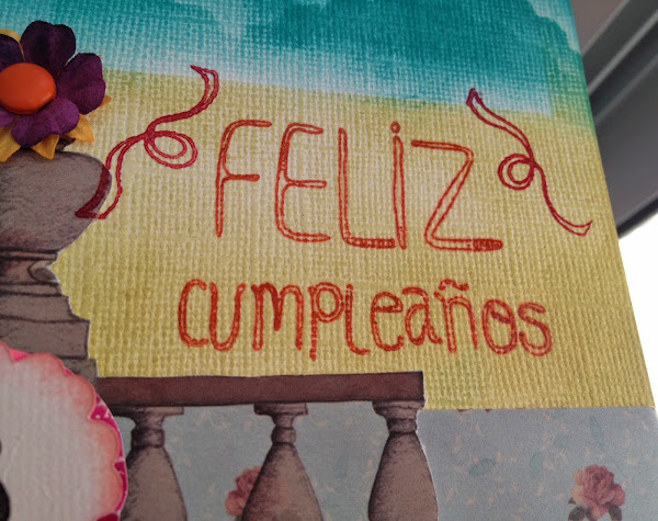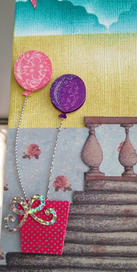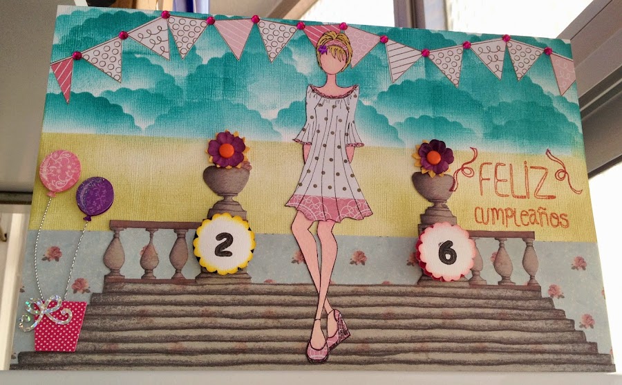 Os enseño una tarjeta de felicitación con unas medidas un poco especiales, ya que eramos varios para firmar. Las medidas es de 30x15 y esta echa con la tecnica de Paper Piecing con un sello de Prima, tintas distress para el cielo y el verde, y las escaleras es de la colección de Sesé de Marisa Bernal en donde recorte tambien las escaleras junto con un trozo del fondo de rosas del mismo papel, las banderolas son de la colección de American Crafts, en donde tambien las recorte y les añadi unas perlas en color rosa fuerte y unas flores como decoración con brads. Tambien hay un sticker de regalo con unos globos y aplicación de embossing en algunas zonas.