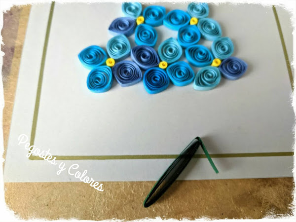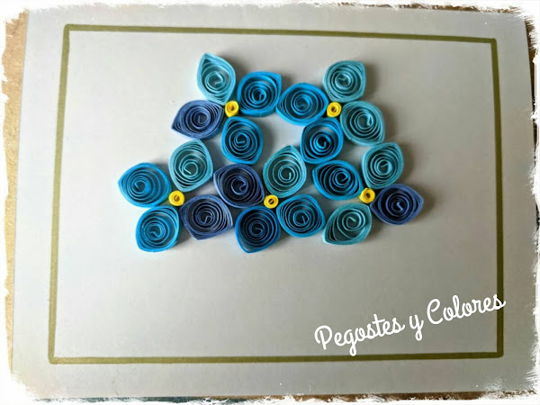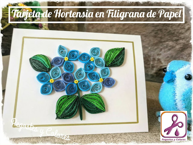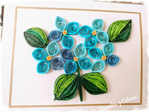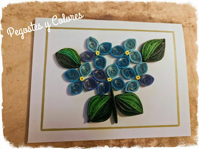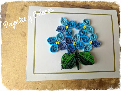 Esta tarjeta la he hecho especialmente para mi mama por el día de las madres. Nuevamente elegí la filigrana en papel, estoy tratando de practicar algunas de las técnicas que mas me gustan y que últimamente he desatendido.A mi mama le encantan las rosas, pero no contaba con suficiente papel en varios tonos para hacérselas del color rosado que le gusta, así que me decidí por hacerle una hortensia, porque le encanta el color azul tanto como a mi.