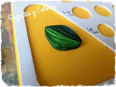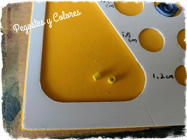 3.- Hacemos los centros de cada flor, 5 en total, enrollando 1/4 de una tira amarilla en la herramienta y pegarla apretada sin desenrollarla.