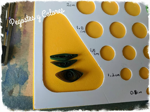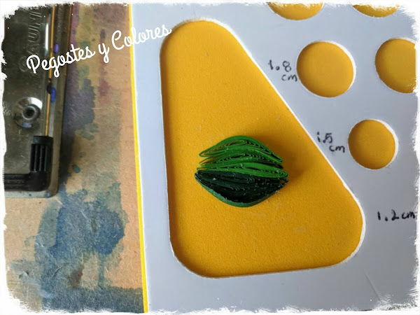 Primero enrollamos una tira verde oscuro, estas que tengo son mas largas, de 45 cm y las dejo desenrollar dentro del circulo mas grande en mi plantilla. Pego el extremo y formo una lagrima con un lado plano de un lado, hago esto otras dos veces para tener tres piezas como en la foto.