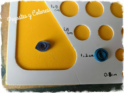 2.- Comenzamos haciendo los pétalos para 5 flores, un total de 20 pétalos en diferentes tonos de azul y lila. Enrollamos cada tira en la herramienta con ranura para filigrana y soltamos el enrollado dentro de la plantilla de circulo de 1.2 cm de diámetro. La dejamos que se desenrolle por si sola y luego pegamos el extremo con una gota de pegamento, la presionamos muy ligeramente para que se haga una forma como de ojo, pero ancha. Hacemos eso para todos los petamos.