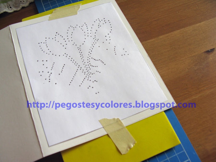 2.- Colocar una base dura y protectora de base sobre la mesa, luego algo suave pero firme como un pedazo de foamy, la tarjeta que vamos a picar y encima el patrón. Puede hacerse también con un tapete viejo de mouse de computadora, pero es muy importante poner o tener algo firme debajo de la base esponjosa porque si no, el calado o picado va a quedar marcado también en nuestra mesa.
