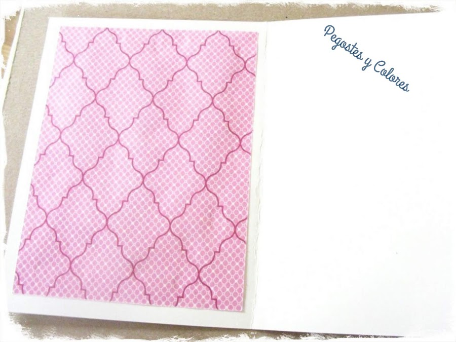 6.- Al finalizar habrá que tapar la parte trasera de la tarjeta con una hoja bonita, en este caso la puse de scrapbooking. Todo el cartón y papel que utilizo es libre de ácido.