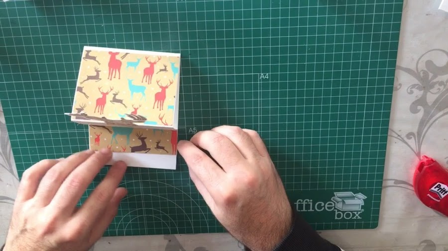 Con un papel decorado acorde, cubriremos la parte superior para tapar el agujero del recorte y con el mismo papel haremos un tope para que se mantenga levantada al doblarla, tal y como podéis ver,