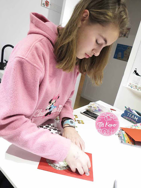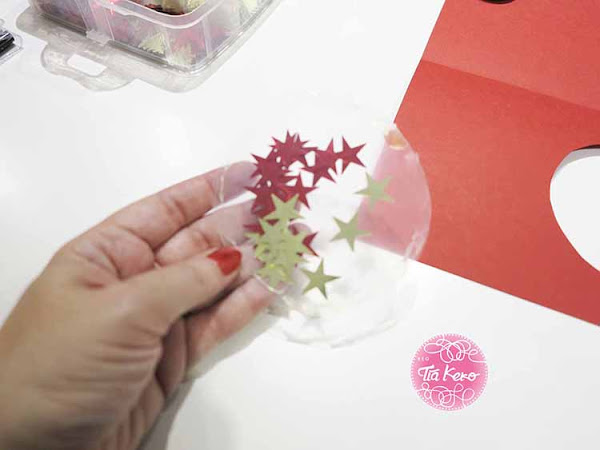Ahora cogemos dos trozos de plástico un poco más grandes que el círculo de la tarjeta, ponemos confeti en los dos plástico y los pegamos con silicona caliente, de esta manera, tendremos un circulo con confeti en movimiento dentro de él.