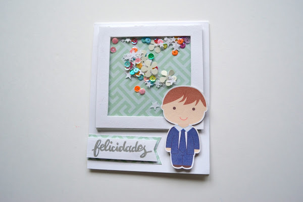Es muy frecuente regalar dinero al niño que hace la Primera Comunión (y para mí mucho mejor, ya que es dificilísimo acertar con un regalo para un niño de 9 ó 10 años...). Pero para que hacer este regalo no resulte tan frío como entregar un sobre con billetes dentro, he preparado una tarjeta tipo shaker card (de las que tienen una venta con cositas que se mueven dentro), con un bolsillo en el interior para meter el dinero o una tarjeta regalo.