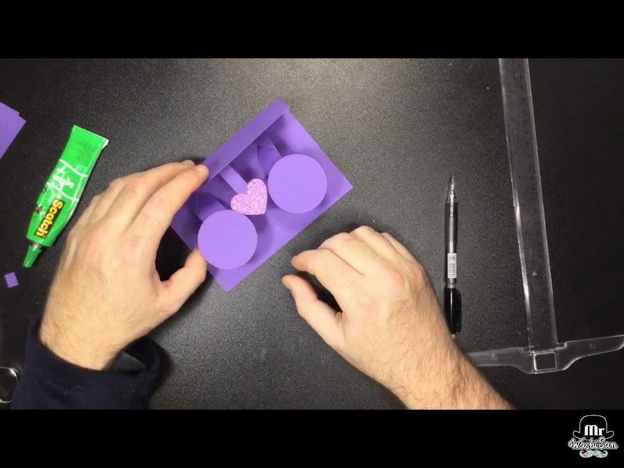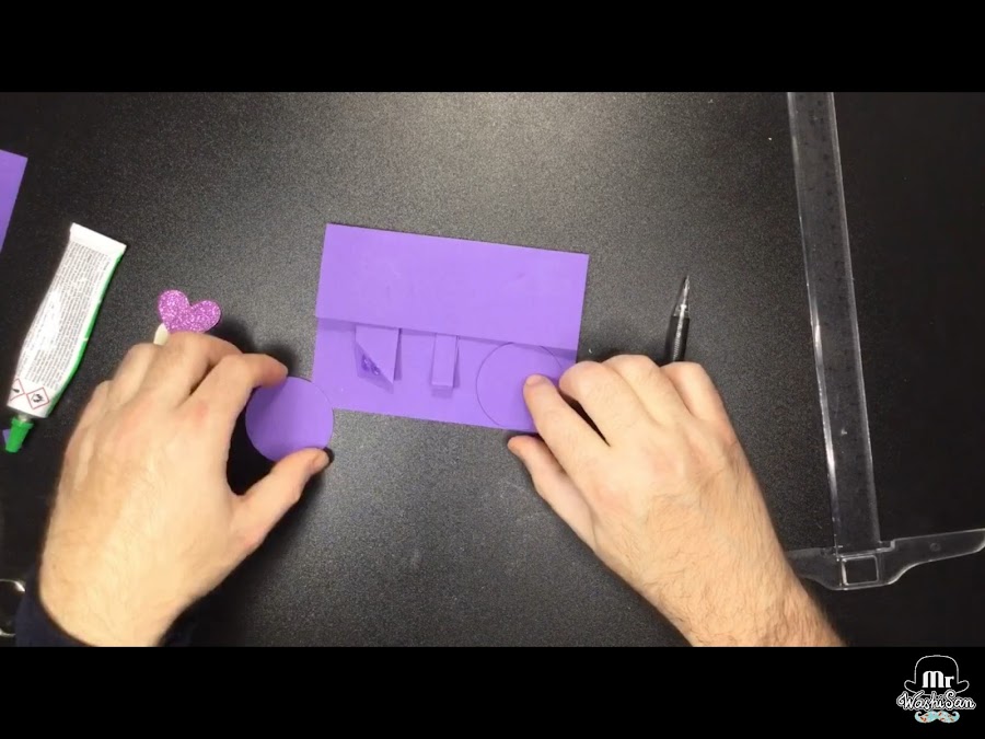 Necesitaremos también dos círculos de 5 cm y un corazón troquelado de cartulina con purpurina.