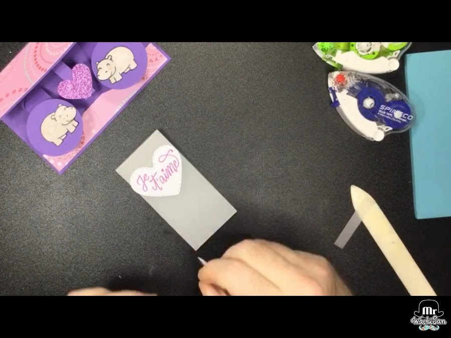 Como esta tarjeta tiene tendencia a abrirse le haremos un cinturón de papel vegetal que la mantenga cerrada que decoraremos con un corazón blanco donde hemos escrito en francés Je taime.