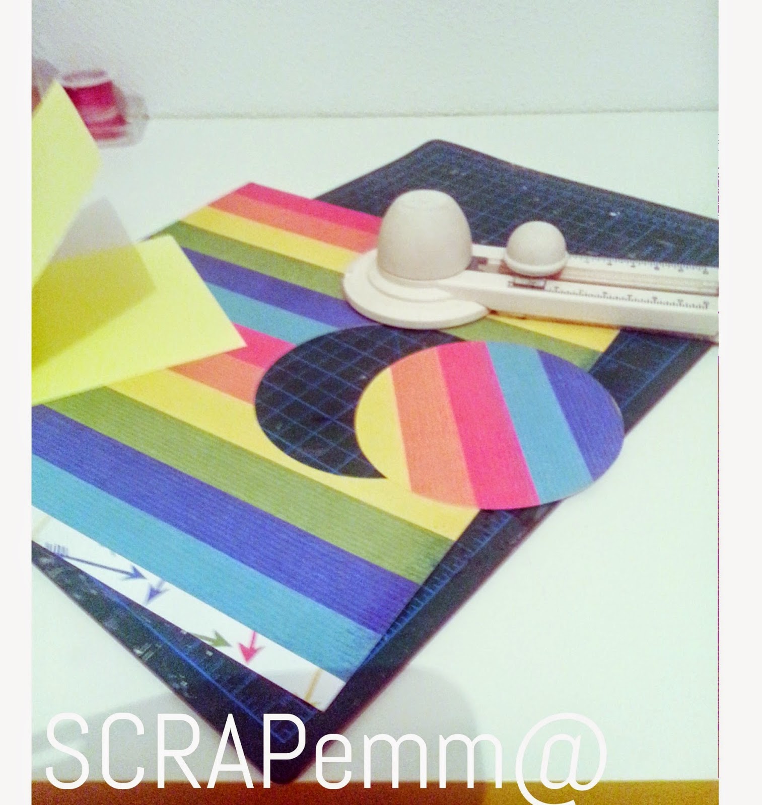 2. Recortaremos con un troquel de círculos una circunferencia sobre la zona rayada del papel que contenga los colores que queremos que aparezcan en nuestra tarjeta.