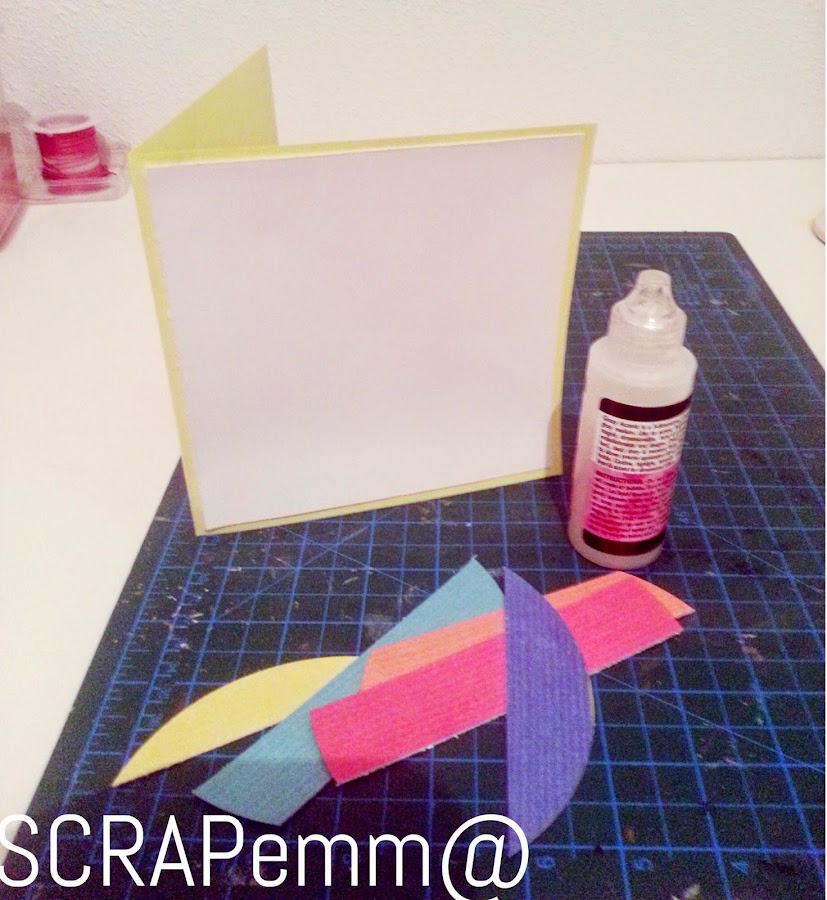 3. Recortaremos por las líneas separando la circunferencia en tantas partes como colores tengamos. Pegamos la cartulina blanca (14x14) sobre la tarjeta (cartulina amarilla) que habremos doblado teniendo dos partes de 15x15.