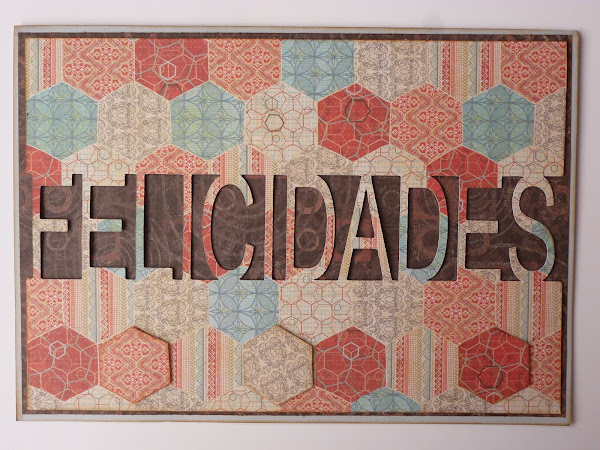 Puse debajo un papel con tonos oscuros para que las letras resaltaran sobre el fondo. Y aunque no se ve bien en la foto, recorté varios exágonos del dibujo del papel y los coloqué con cinta adhesiva 3D en la parte de abajo. Cuando el agraciado la vio dijo: "Chulo", lo que en su caso quiere decir que le gustó mucho.