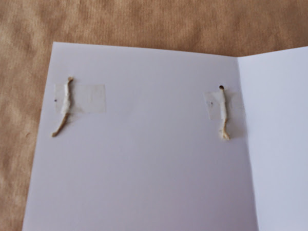 Pasamos la cuerda de yute por los agujeros que previamente hemos hecho a la tarjeta y pegamos con celo para que quede bien sujeta.