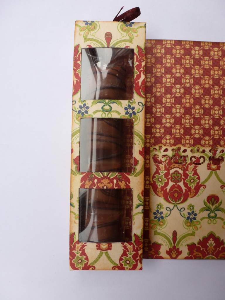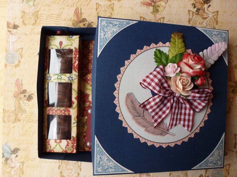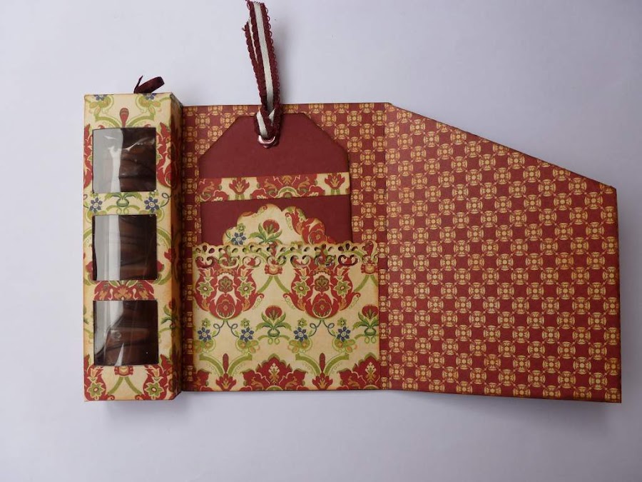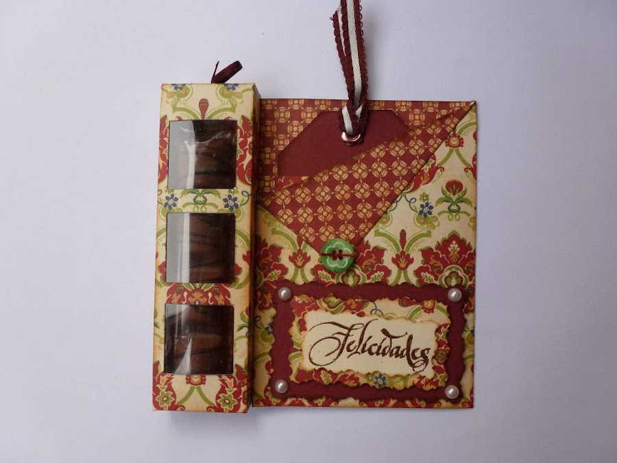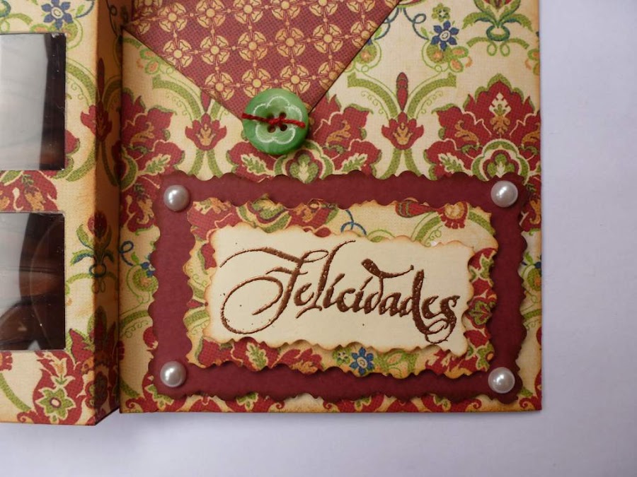 La cajita lateral es para poner una barrita de cholocate, o lo que os guste. Yo le hice tres ventanitas y puse por dentro un trozo de acetato. Y en la solapa, el sello de Felicidades embosado con polvos color cobre.