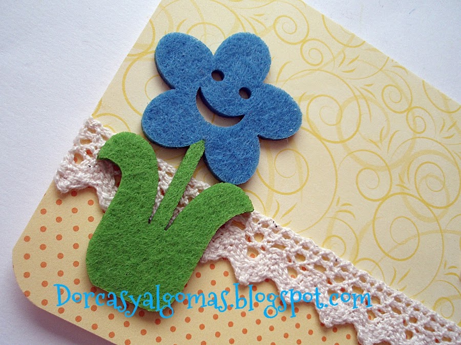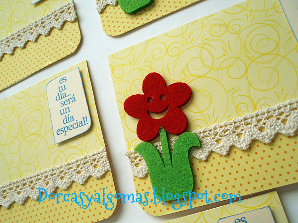 Os muestro unas tarjetas de felicitación en las cuales he utilizado unos troqueles de fieltro, en esta caso unas flores y con un mensaje o leyenda: "Es tu día... será un día especial!"