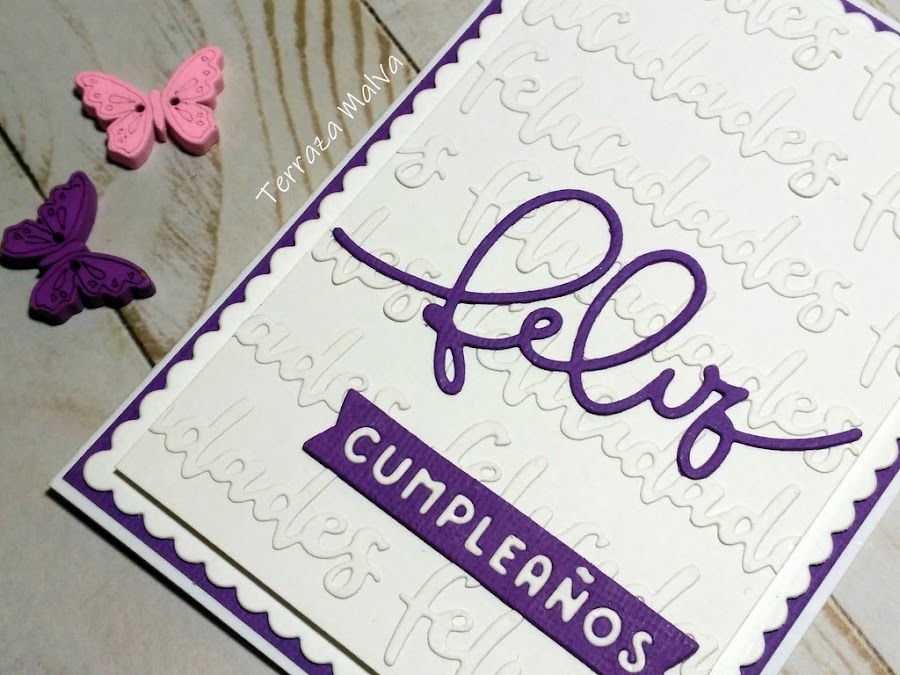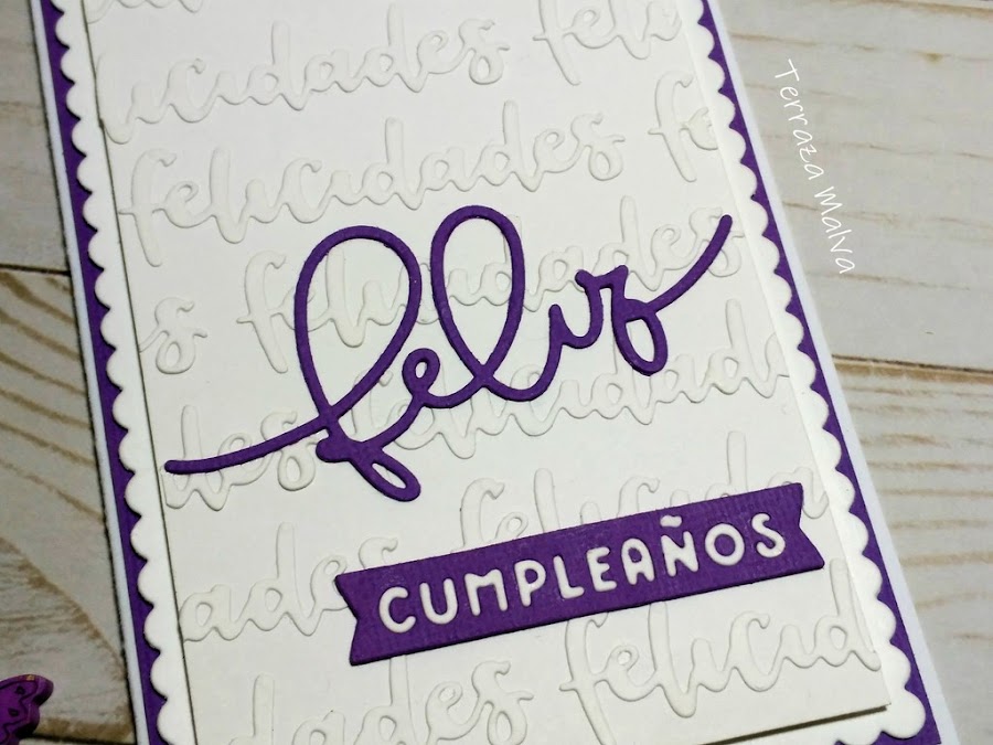 El efecto del falso embossing lo he logrado utilizando la misma cartulina para los troquelados de la palabra "felicidades" y el panel trasero.