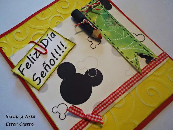 Detalles: Base dela tarjeta rojo, Mat (alfombrita) en color amarillo embosado y resaltado con lija, papel con fondo de siluetas de Mickey, banderín verde, un botón en forma de làpiz y cartel colocado con un ganchito. Detalle de cinta a cuadrille.
