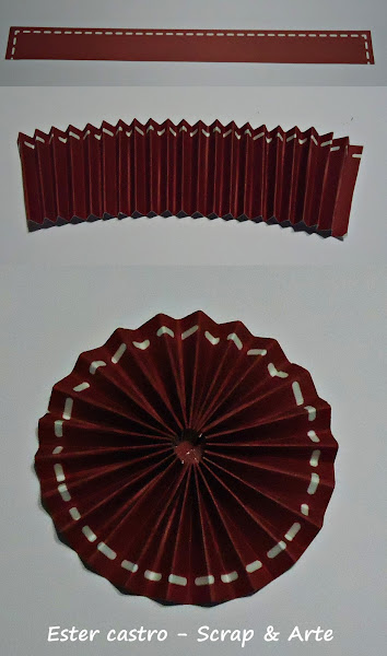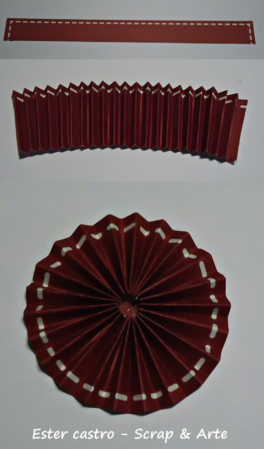 Realice un rosetón cortando una tira de lámina roja (aproveche el bordecito con pespunte) de 30 cm de largo x 2 cm de ancho.