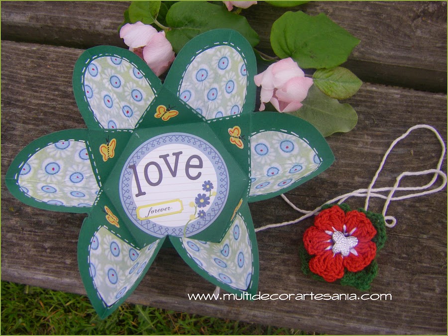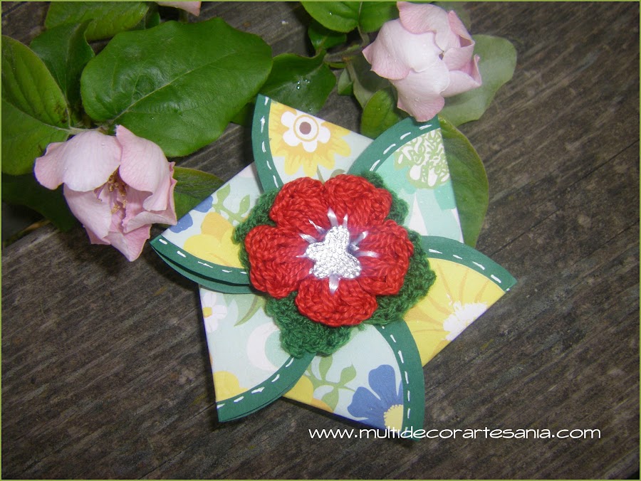 Ya tenía ganas de hacer esta bonita flor, para ello he utilizado un papel lleno de color y pequeñas mariposas que son toda una sorpresa al abrir la tarjeta. Como cierra una flor de crochet roja con hojas verdes sobre la que se ha posado una mariposa brillante.
