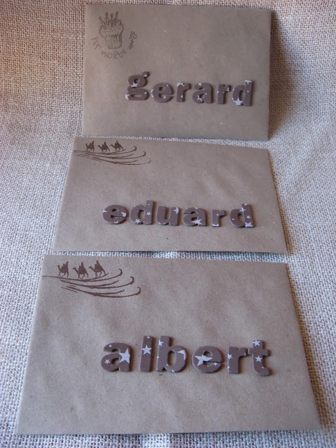 Com que era el dia de reis i també tenia que donar un regalet als mes nebots, vaig comprar aquest sobres que ,m"agrada molt la textura rustica que tenen i vaig posr-hi els noms retallats amb la big i uns segells . Els dels tres reis per els regals de reis i el de per molts anys, al sobre on hi anava la tarjeta.