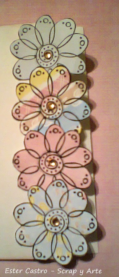 y las pegue sobre el borde que cortamos, la mitad del la flor y el resto de la flor completa la tarjeta de esta manera.