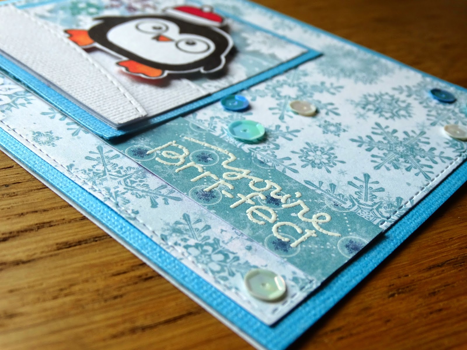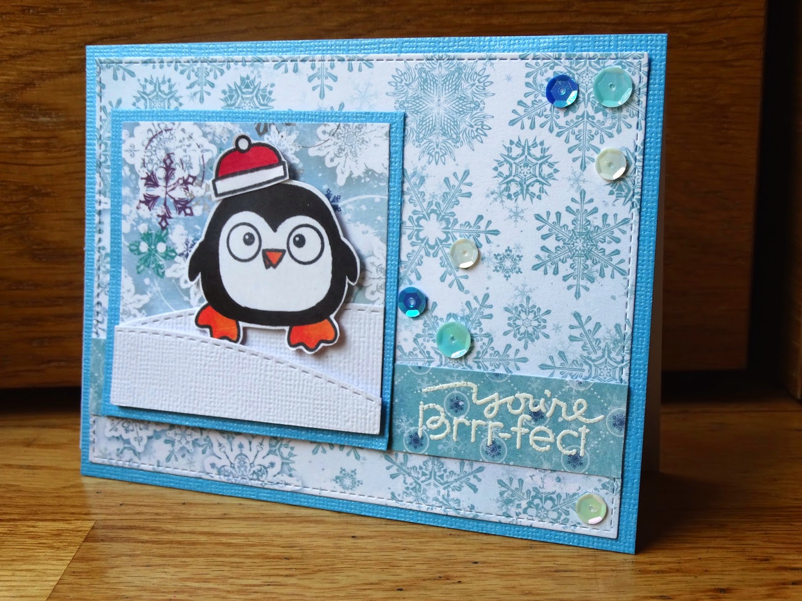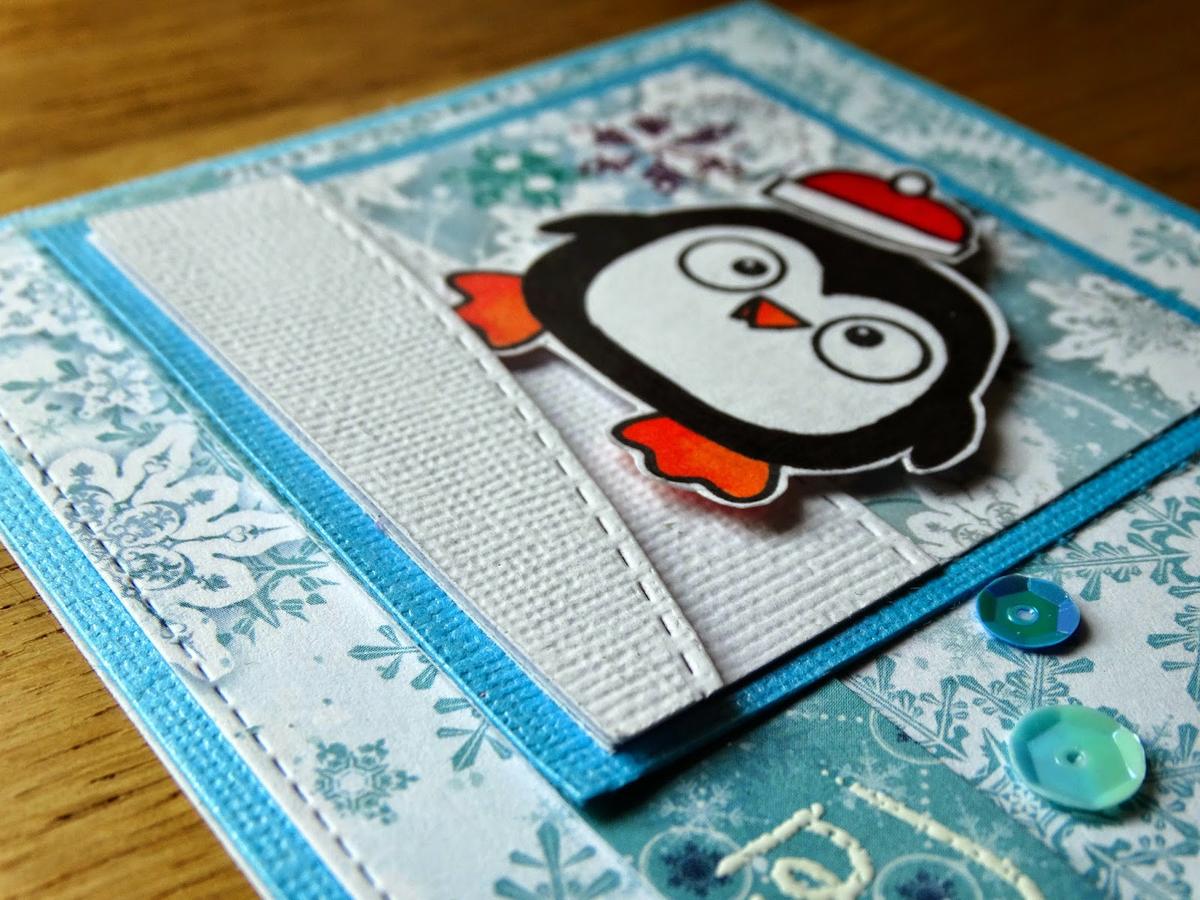 He usado los papeles del kit de enero de Simon Says Stamp. El pingüino es un sello de Paper Smooches, del set Chilly Chums. Unas lentejuelas para darle un toque de brillo y el sentimiento embossado con polvos blancos.