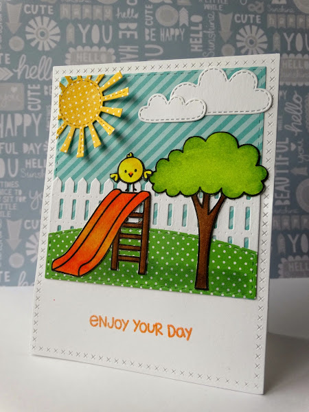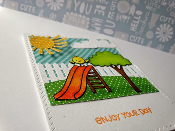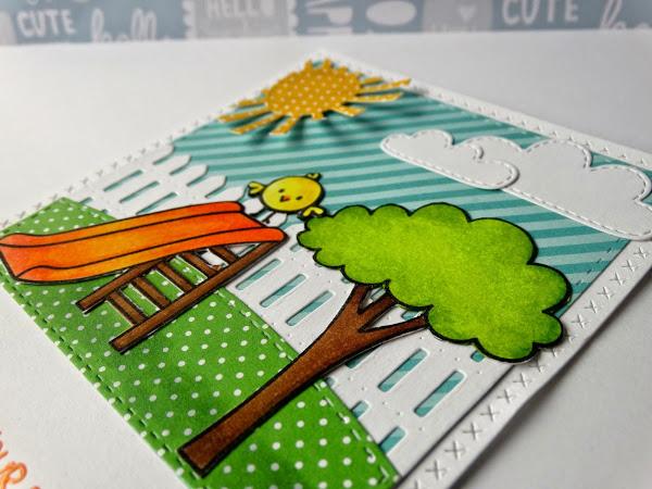 Para crear la escena usé el set de sellos "Let"s play" de Lawn Fawn, que pinté con Spectrum Noir y luego recorté a mano.