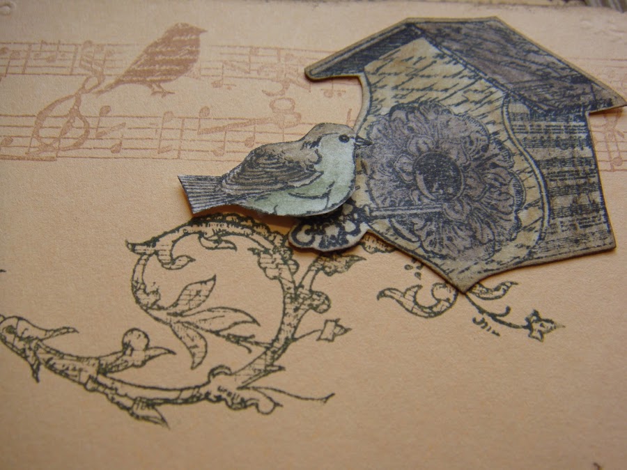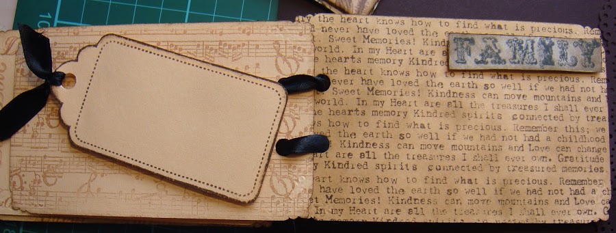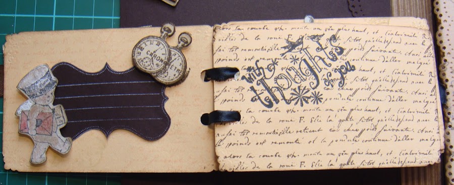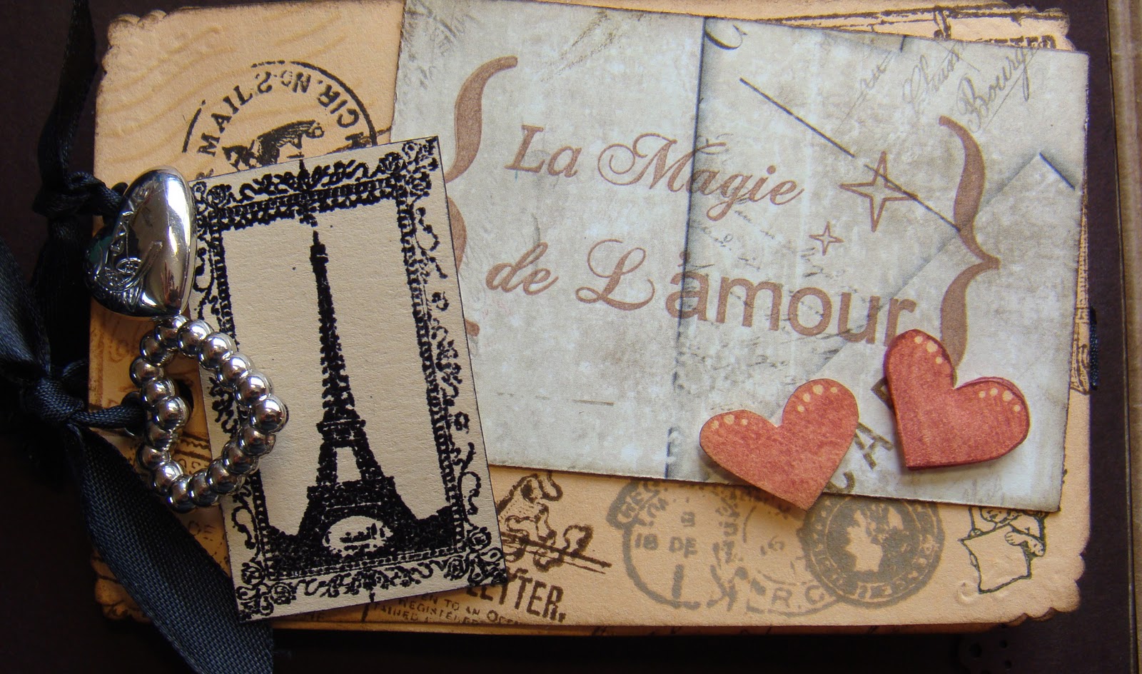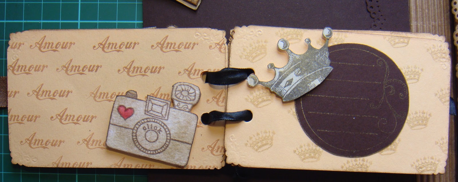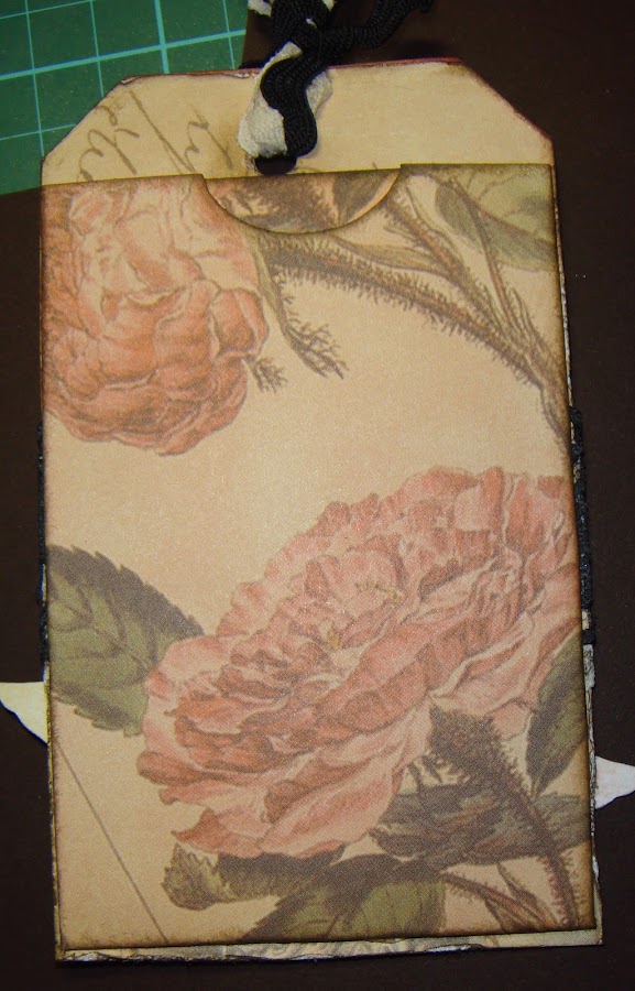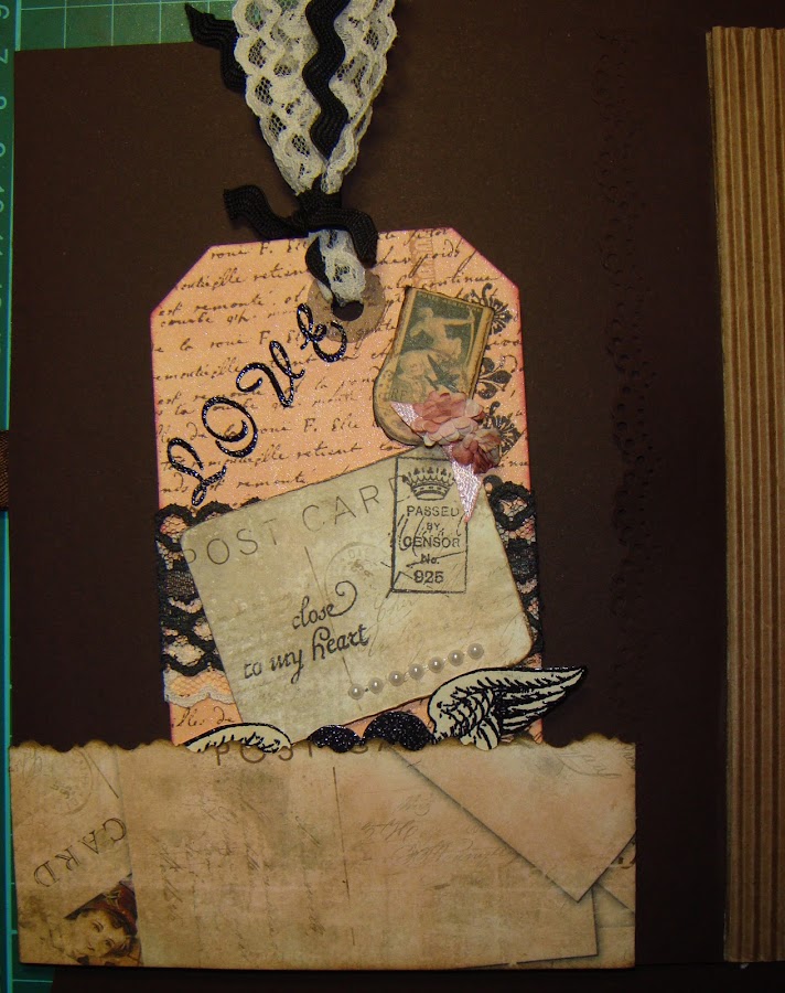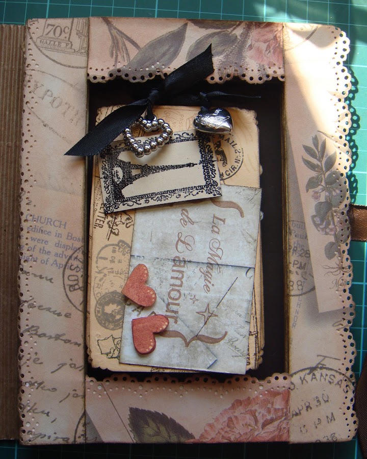 Los papeles son de Graphic 45 de la colección Le romantique pero modificados con distress tattered rose para que quedara mas armónico con el resto del conjunto (eran muy verdes), las mariposas en 3d fueron un regalo de Yolanda, gracias! Cuando lo abrimos nos encontramos con un tag hecho con la misma distress, polvos de embossing negros, a la imagen postal de la esquina le he agregado cartón corrugado entintado con distress walnut stain para darle mas relieve y por detrás tiene un bolsillo para guardar fotos en tags pequeños.