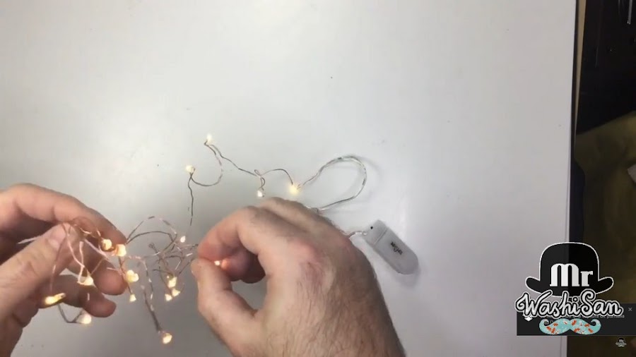 Así que no me decidía a intentarlo hasta que se me ocurrió una idea para hacer una tarjeta con luces led de forma muy sencilla y mucho más económica que utilizando los chivitronics. Se trata de utilizar guirnaldas de luces led. Últimamente han salido en el mercado luces led con alambre, que son muy flexibles, se pueden doblar a tu gusto y llevan un recubrimiento que las hace aislantes e incluso sumergir en agua. Este tipo de luces era ideal para poderlas introducir en una tarjeta pero normalmente vienen con unas pilas muy grandes, lo cual era inviable, pero un día descubrí que existian estas guirnaldas con batería de botón y me compré un paquete que contenía cuatro guirnaldas de veinte leds que cada una con dos pilas botón. Vamos a ver cómo utilizar una de estas guirnaldas para confeccionar una tarjeta con un árbol de Navidad que se ilumina totalmente.