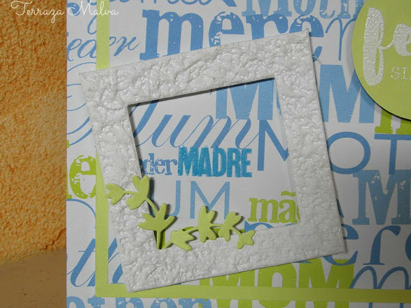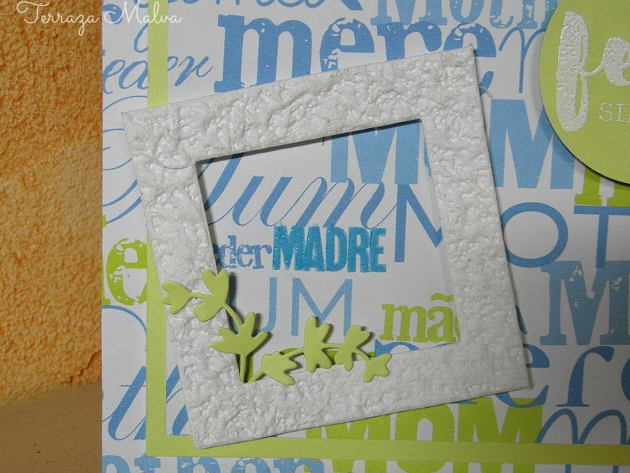 La palabra "Madre" está destacada tambien con polvos de embossing transparente que fijé con un rotulador de tinta Versamark. Y para resaltarla aún más la enmarqué con un bonito marco blanco con textura sobre almohadillas 3D en el que situé también unas ramitas troqueladas.