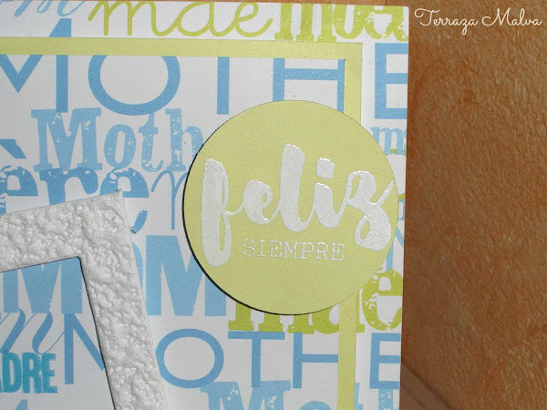 Como base de la tarjeta he utilizado un precioso papel con la palabra "Madre" escrito en varios idiomas. El fondo es blanco y las palabras están escritas en varios tonos de azul y verde, así que esos son los colores que he utilizado en el resto de la tarjeta.