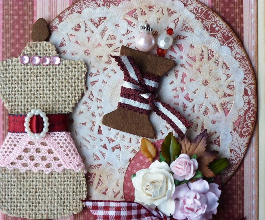 La silueta del maniquí la he entintado con Distress Vintage Photo, y la he "vestido" con tela de saco de la que se usa para encuadernación. Tiene por detrás un apresto que hace que se trabaje muy bien con ella. Le he añadido un trozo de bordado de algodón en color rosa, un lazo granate con hebilla de perlas, y unos brillantitos adhesivos a modo de collar.
