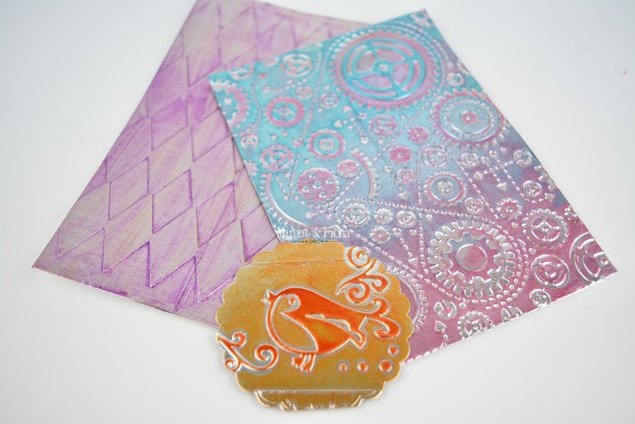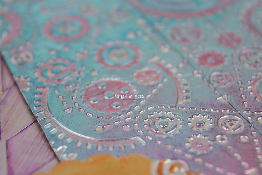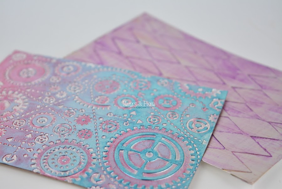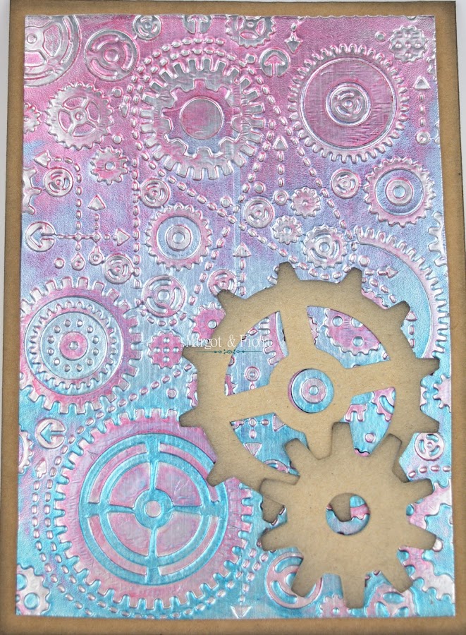 Placa de " maquinaria": Carpeta de embosar Blueprint and Gears de Sizzix. Un degradado con las tintas Stazon teal Blue y Alcohol Ink de Adirondack en tono cranberry.