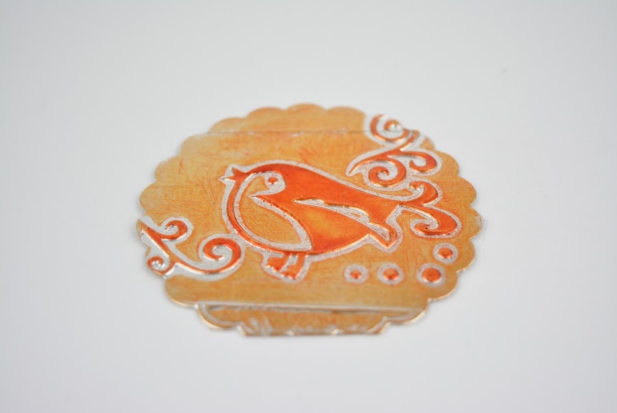 Una vez tenemos la pieza ya preparada, si nos apetece, le damos color. En este caso he usado tinta Stazon en color Pumpkin, usando directamente el tampón y mis dedos. Dejamos secar y ya tenemos esa pieza decorativa metálica hecha.